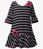 Comfortable and cute, this black and white stripe dress with adorable bell sleeves and flower trims make this the perfect dress for any day. Pair it with some tights or knee high socks and ballet flats to complete the look!