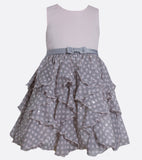 She'll love this baby pink and soft gray dress with it's polka dot ruffles perfect for twirling, with just a touch of spangle!