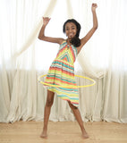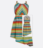 This dress is the perfect addition to your girls summer wardrobe! Printed chiffon sundress, with unique asymetrical hem, and braided v-back straps.