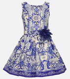 She'll light up the room with social grace in this stunning poplin dress, inspired by traditional painted porcelain. It features princess seams, a drop waist, and a matching flower.