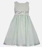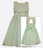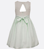 Lace over linen, a dainty satin bow, and adorable back detail, in light aqua makes this the perfect dress for every ocassion, from a tea party with friends to Easter Sunday.