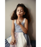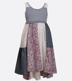 A great dress for her many spring and summer activities.  Chambray, crochet, and floral print patterned skirt with striped bodice.