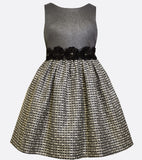 Sophisticated, yet sweet, this is the perfect dress for all of her special moments. Featuring a soft knit silver bodice with a metallic tweed skirt and a lovely flower waist band.
