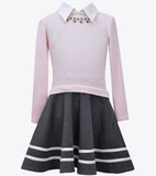 A pale pink knit sweater meets a soft gray twill skirt with accents of white and a jeweled neckline; making this look both sweet and sophisticated. The dress gives an illusion of many layers without all the bulk. Perfect with a pair of tights and flats or tall boots and a simple white bow!