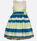 If you're little one is bright and bold, and pink is not her favorite color...this is the party dress with stripes of teal and light green is perfect for all her spring events!