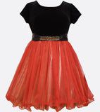 This classic holiday dress will make her the star of the party with a black stretch velvet top, gold lame lining and red mesh layered skirt, all tied together with a gem encrusted waistband.